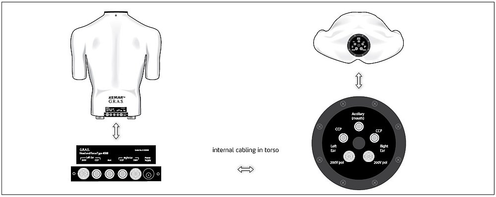 所有内部线缆均在工厂安装。用于连接仿真耳或传声器的插座位于颈部上方,连接仪器的插座位于背部下方,方便使用。